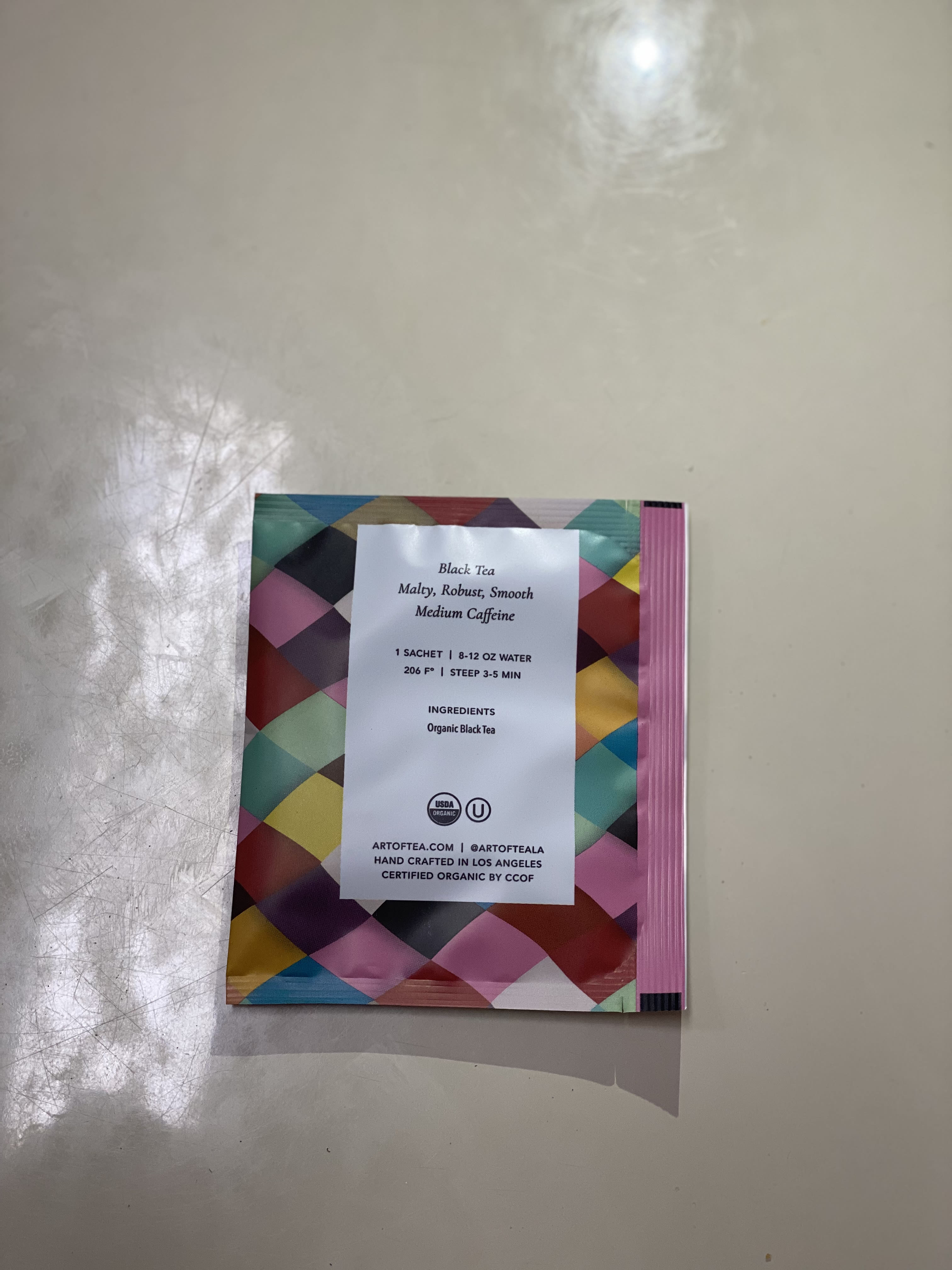 The Art of Tea English Breakfast Sachet is a single-serve version of the loose-leaf black tea blend, made with organic and Fair Trade Certified ingredients. The tea sachet is described as convenient for on-the-go tea drinkers or for those who prefer pre-measured portions.